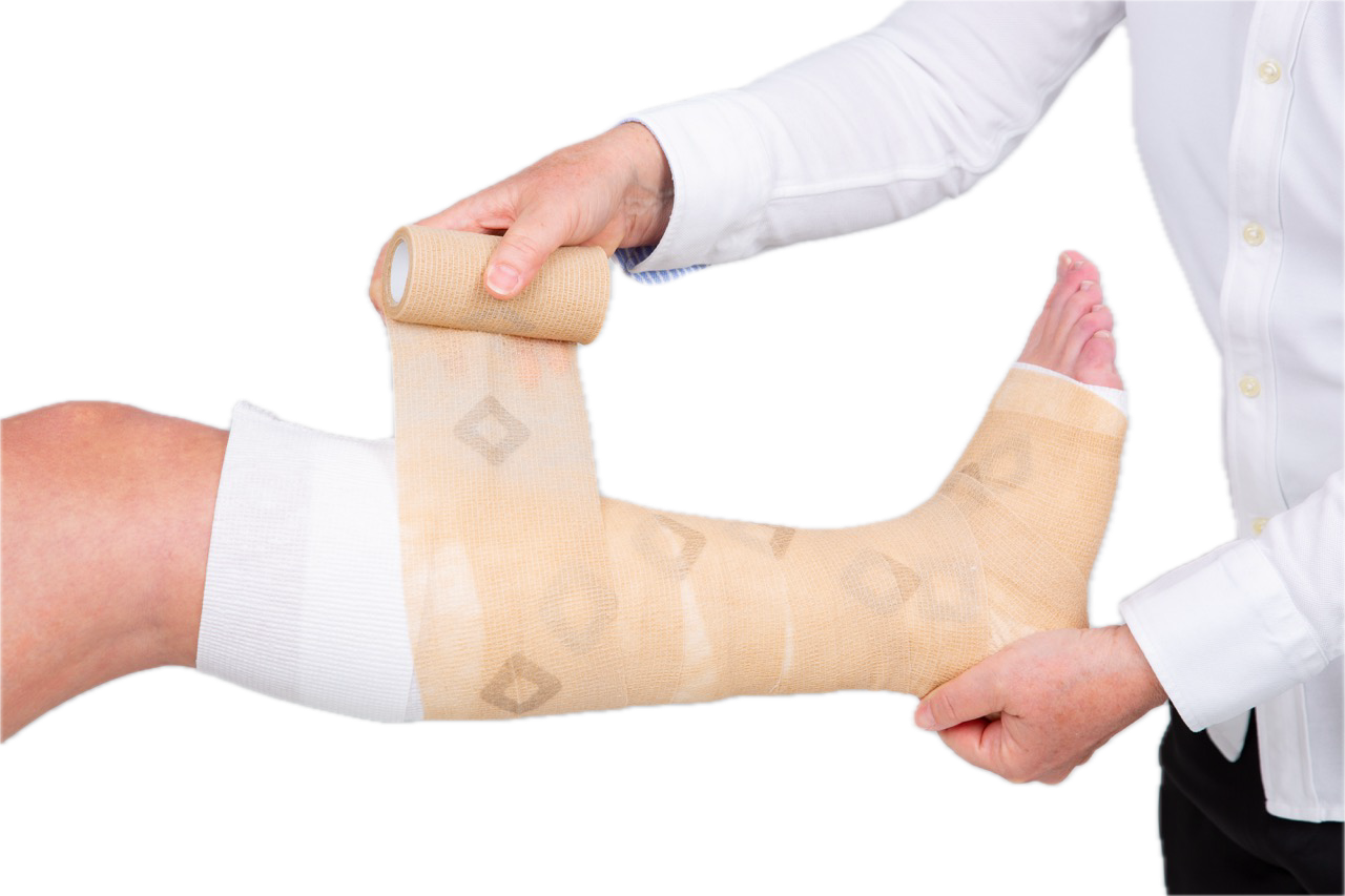 4. Wickeln Sie die weiße Polsterbinde ab oberhalb des Knöchels unter vollem Zug mit einer Überlappung von 50% spiralförmig um das Bein an. Etwa 2 cm unterhalb des Fibulaköpfchens reißen Sie überschüssiges Bindenmaterial ab. Eine zusätzliche Fixierung ist nicht notwendig, aber bei Bedarf können Pflasterstreifen verwendet werden.
